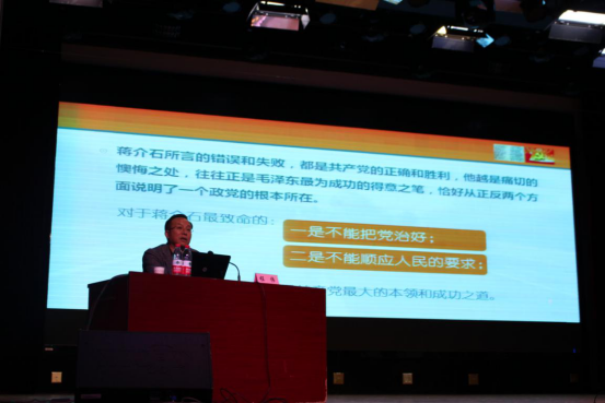 为深入贯彻落实习近平新时代中国特色社会主义思想和党的十九大精神,贯彻落实习近平总书记关于教育的重要论述,特别是在学校思想政治理论课教师座谈会上的重要讲话精神,推动《关于深化新时代学校思想政治理论课改革创新的若干意见》、《“新时代高校思想政治理论课创优行动”工作方案》等文件部署,落实我院思政工作整改意见,推动建立高校党委书记、校长带头抓思政课机制,做好校领导进思政课的工作安排,更好发挥思政课主渠道的作用,增强我院思政课的针对性和实效性,进一步拓宽我院学生理论视野,提升其综合素养,我院党委常务副书记程伟于10月28日晚在学术报告厅为学生讲思政课。这次思政课的主题为:从《蒋介石日记》看中国共产党。