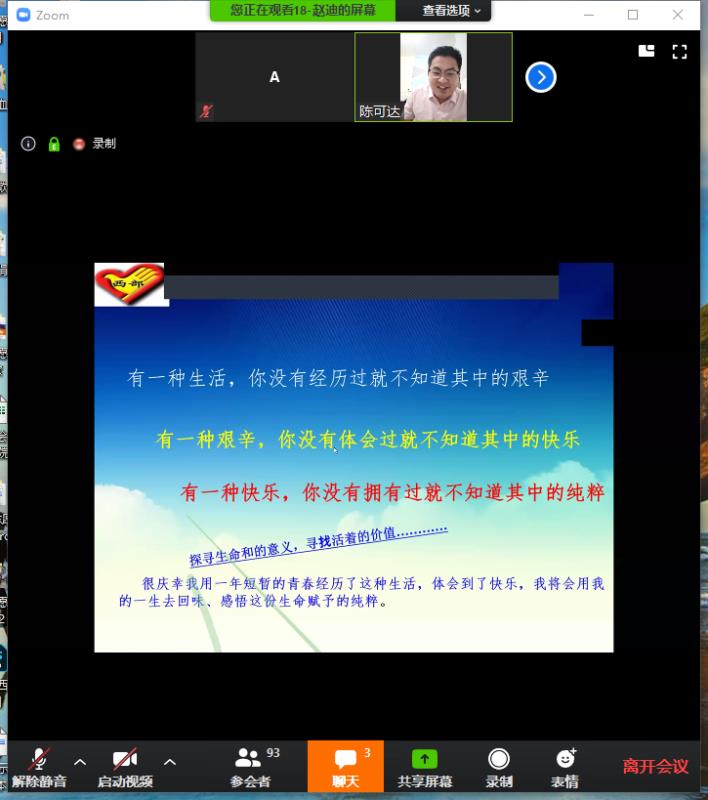 会上,播放了大学生志愿服务西部计划宣传视频,团委张洪来老师传达了全国项目办关于2020招募工作正式启动的相关内容和要求,并对志愿者政策、志愿者生活保障、如何参加西部计划三个方面,为毕业生详细解读了西部计划相关政策及待遇,同时部署了我院西部计划的工作安排。让学生对西部计划有初步、直观的了解。来自新疆巴音郭楞蒙古自治州的西部计划志愿者2019届毕业生赵晓峰、来自新疆维吾尔自治区和田地区的西部计划志愿者2019届毕业生陈可达、来自陕西省商洛市西部计划志愿者2019届毕业生蒙祖昌也来到直播间与同学们进行了交流分享。他们分享了自己参与西部计划的初衷、现任岗位的工作情况、参与西部计划的收获和未来的打算。他们扎根基层,服务人民的初心和故事感染和鼓舞了在场的每一个人。随后,院团委针对同学们存在的问题通过评论区留言和连麦等方式一一进行了答疑解惑。