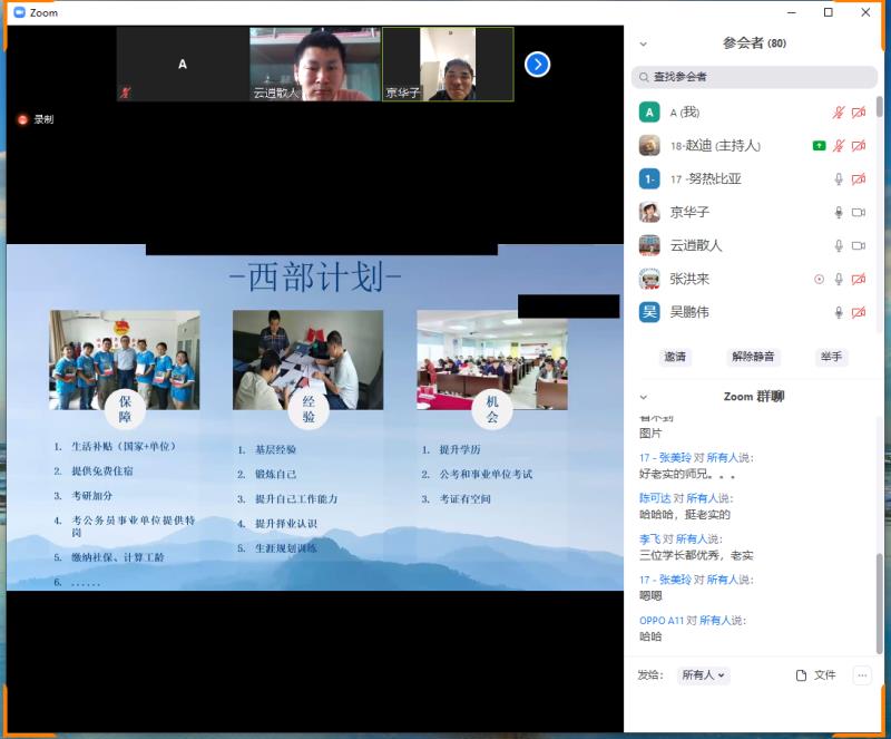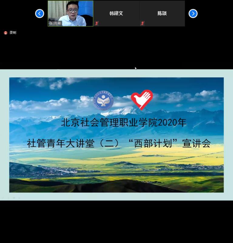 为进一步做好大学生志愿服务西部计划工作,号召更多的青年到基层到西部去受教育、长才干、做贡献,4月24日晚上7:00—9:00,学生处(团委、招生与就业指导服务中心)联合举行了社管青年大讲堂第二讲暨“以志愿之名,赴西部之约”2020年西部计划宣讲会,我院2020届毕业生、志愿者代表、团学骨干共计200余人在ZOOM直播平台参与了会议。