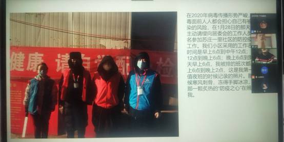 来自民政部101研究所团支部书记田霖和来自我院1702社工团支部的李飞同学、1803护理团支部的王奥同学、1801物业团支部的阿力努尔同学、1803护理团支部的朱霖琳同学、1801殡葬团支部的朱存良同学、1802社工团支部的王光风同学、1801康疗团支部的党民月同学等七名社管青年志愿者分享了各自的抗疫故事。七名社管青年最美抗“疫”志愿者代表分别从抗疫故事、志愿服务工作、志愿服务经历等方面分享了自己的抗疫心得和感悟。他们的故事让人潸然泪下,催人奋进,他们用平凡演绎不平凡,用实际行动践行民政学子、社管青年“民政为民,民政爱民”的工作理念,在志愿服务中彰显青春力量。