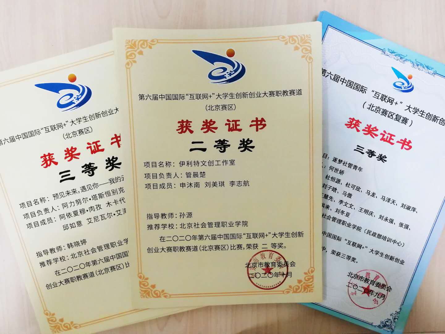 近日,由北京市教委主办、北京邮电大学、北京经济管理职业学院承办的第六届中国“互联网+”大学生创新创业大赛北京赛区比赛落下帷幕。我院11个项目分获第六届中国国际“互联网+”大学生创新创业大赛北京赛区职教赛道二等奖1个、三等奖8个,高教主赛道三等奖1个、青年红色之旅赛道三等奖1个。其中,来自我校社会工作学院的管晨楚同学负责的《伊利特文创工作室》项目获得北京市赛(职教赛道)二等奖。