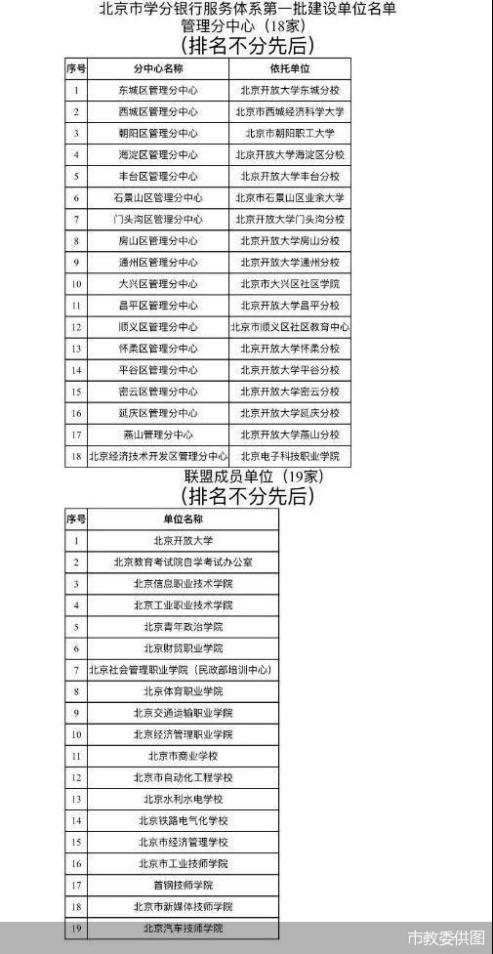 其中,北京市学分银行管理中心设在北京开放大学,负责学分银行的建设、运行和管理等日常工作;学分银行管理分中心依托各区开放大学分校设立,负责区域内学分银行的运行和管理工作;学分银行联盟成员单位由高等学校、中等职业学校、成人院校、行业企业等单位组成,共同倡导资源共享、课程互选、学分互认,主要负责为本单位学习者办理业务。