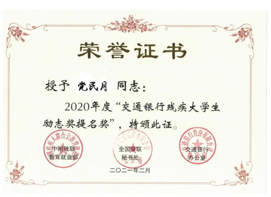 近日,由中国残联教育就业部、全国学联以及交通银行共同主办的2020年度“交通银行残疾大学生励志奖”活动评选结果揭晓,我校康复工程学院康复治疗专业1801班党民月同学获评2020年度“交通银行残疾大学生励志奖提名奖”。我校是北京市唯一获奖的高校,该奖项是对我校优秀残疾大学生模范典型的充分肯定,也是对我校教育工作的高度认可。