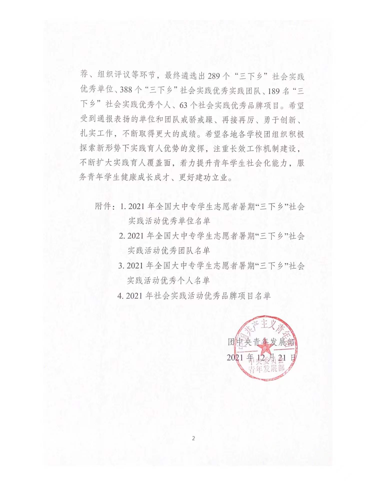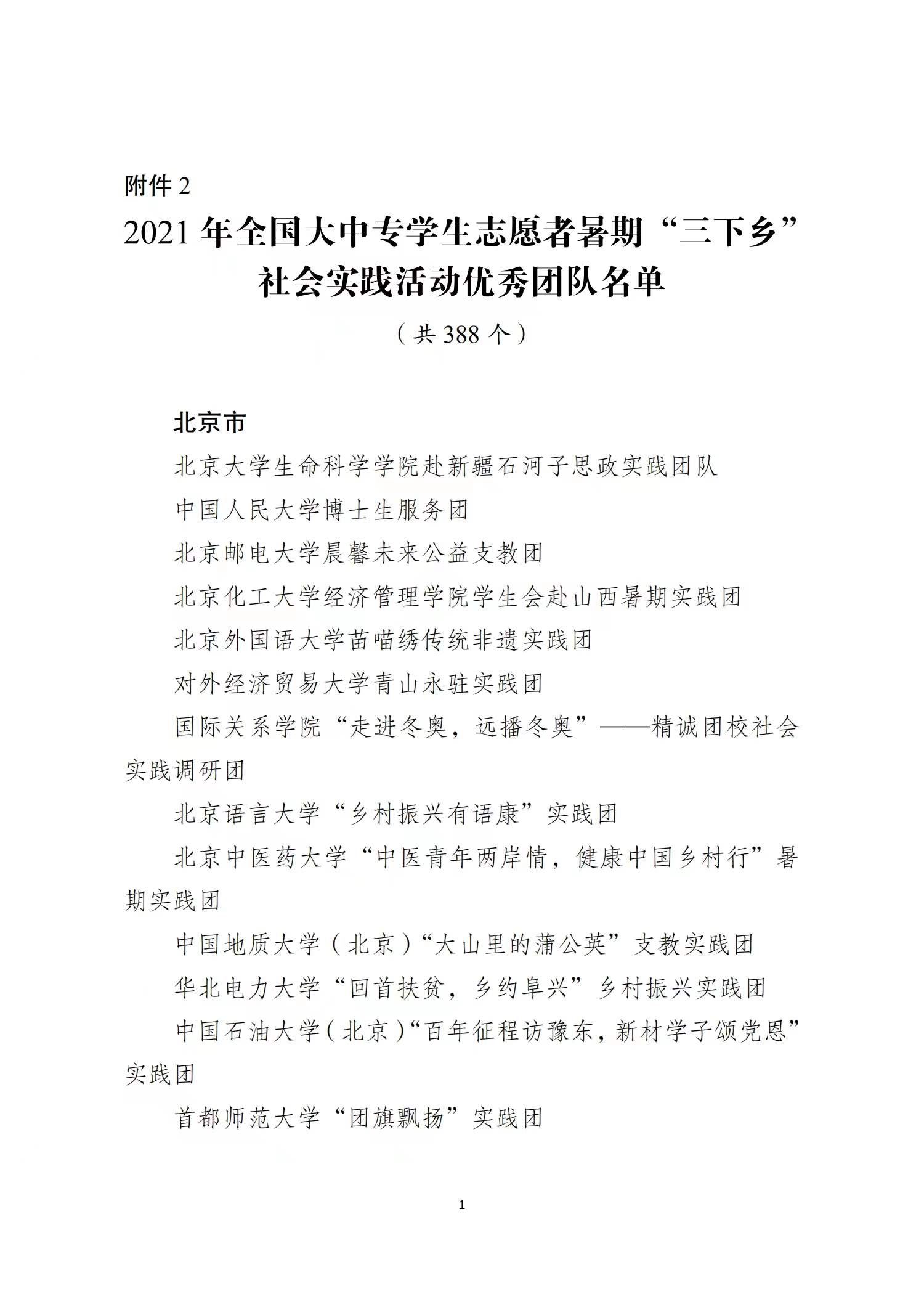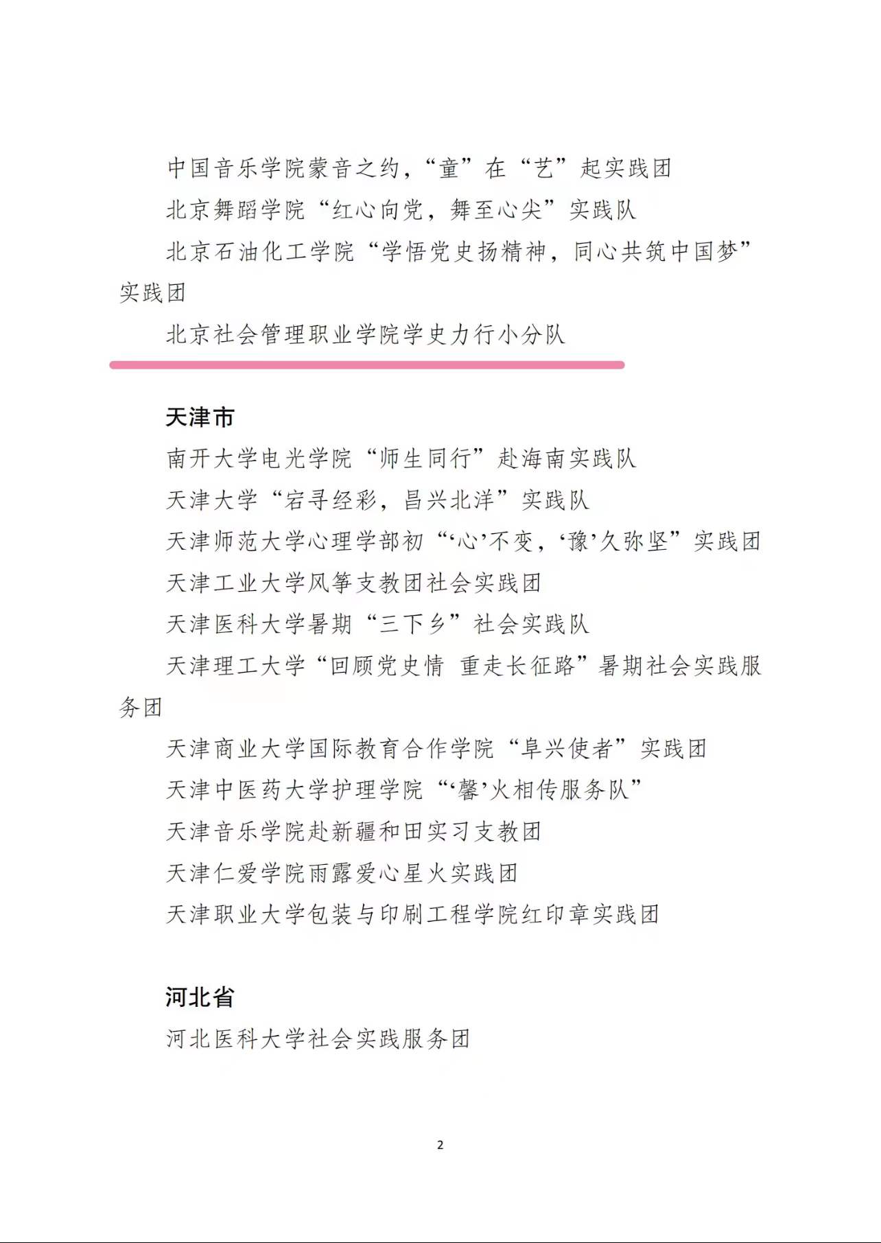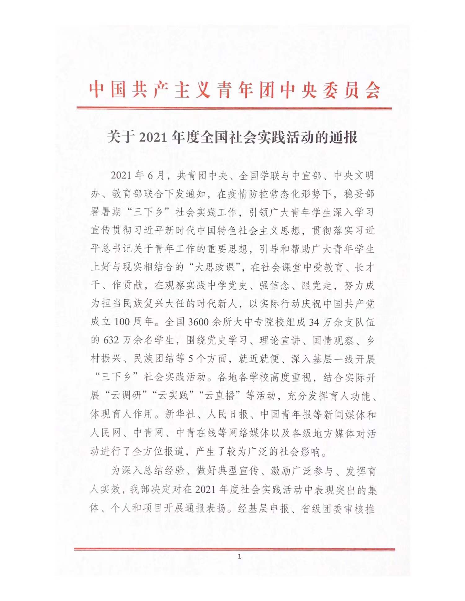 近日,中国共产主义青年团中央委员会下发了《关于2021年度全国社会实践活动的通报》,对289个“三下乡”社会实践优秀单位、388个“三下乡”社会实践优秀团队、189名“三下乡”社会实践优秀个人、63个社会实践优秀品牌项目进行通报表扬。我院团委指导的学史力行小分队荣获2021年全国大中专学生志愿者暑期“三下乡”社会实践活动优秀团队。北京17所高校中,我院为唯一一所高职院校获得此项荣誉。全国3600余所大中专院校、34万余支队伍、632万余名学生参与了此项实践活动。